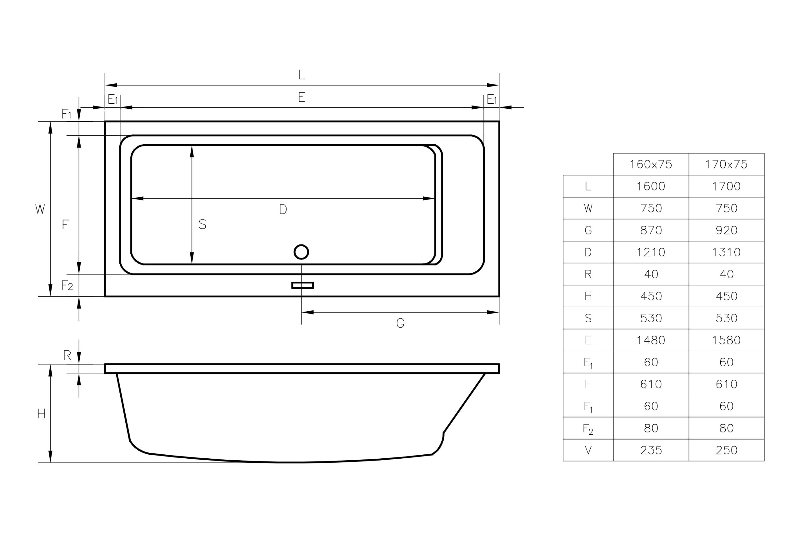A kád 160×75 cm vagy 170×75 cm méretben érhető el, így különböző fürdőszobai méretekhez is ideális választás. A 45 cm-es mélység az átlagosnál kényelmesebb fürdőzést biztosít, míg a középen elhelyezett lefolyó lehetővé teszi, hogy akár két ember is kényelmesen használja egyszerre.
