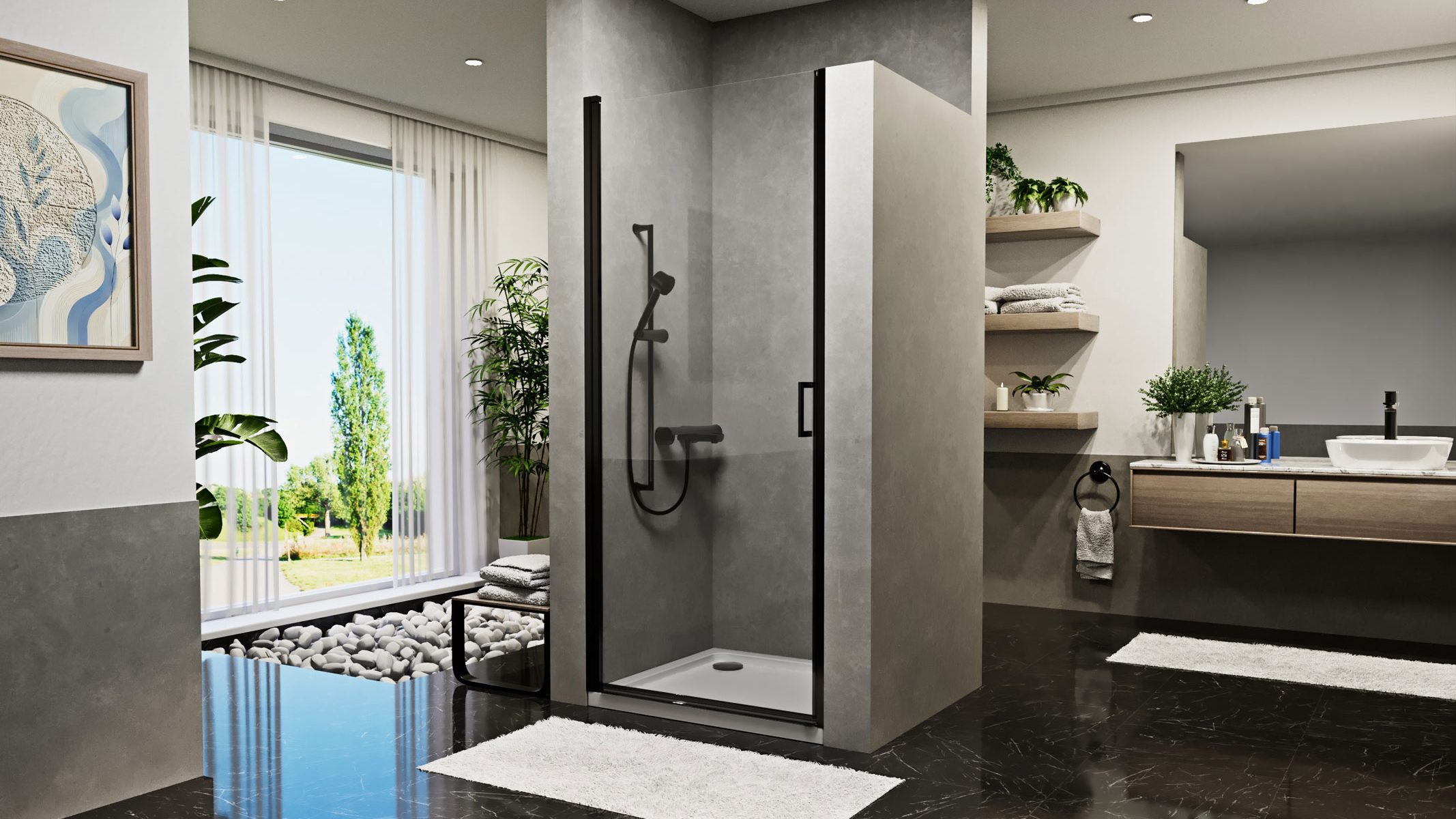 A Vega Black zuhanyajtó 90×195 cm-es méretben érhető el, nagy, 70 cm széles ajtónyílással, amely kényelmes be- és kilépést biztosít. A mágnesesen záródó ajtó és a vízzáró profilok garantálják, hogy a víz ne jusson ki a kabinból, így a fürdőszoba mindig száraz és rendezett marad. Az állítható falprofilok (1,5-2 cm) lehetővé teszik a precíz telepítést, alkalmazkodva a fal egyenetlenségeihez.